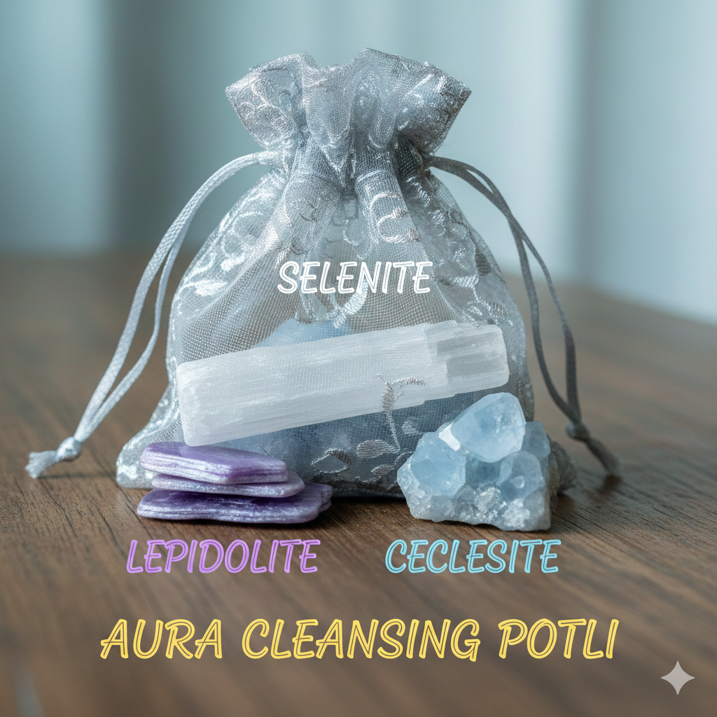 The Aura Cleansing Potli is a powerful healing blend of Selenite, Celestite, and Lepidolite, specially curated to cleanse, protect, and uplift your aura. This sacred potli works gently yet deeply to remove negative energies, emotional heaviness, and mental stress while restoring calm, clarity, and spiritual balance.
