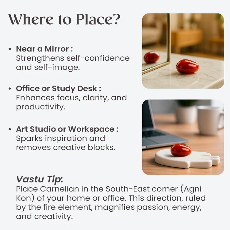 Place Carnelian in the South-East direction (Agni Kon) of your home or office. This fire-dominated zone amplifies passion, motivation, creativity, and success energy.