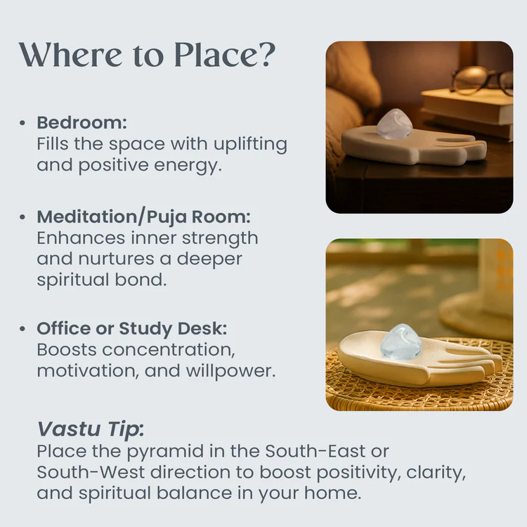 Place the Clear Quartz pyramid in the South-East or South-West direction to enhance positivity, clarity, and spiritual balance in your home or workspace.